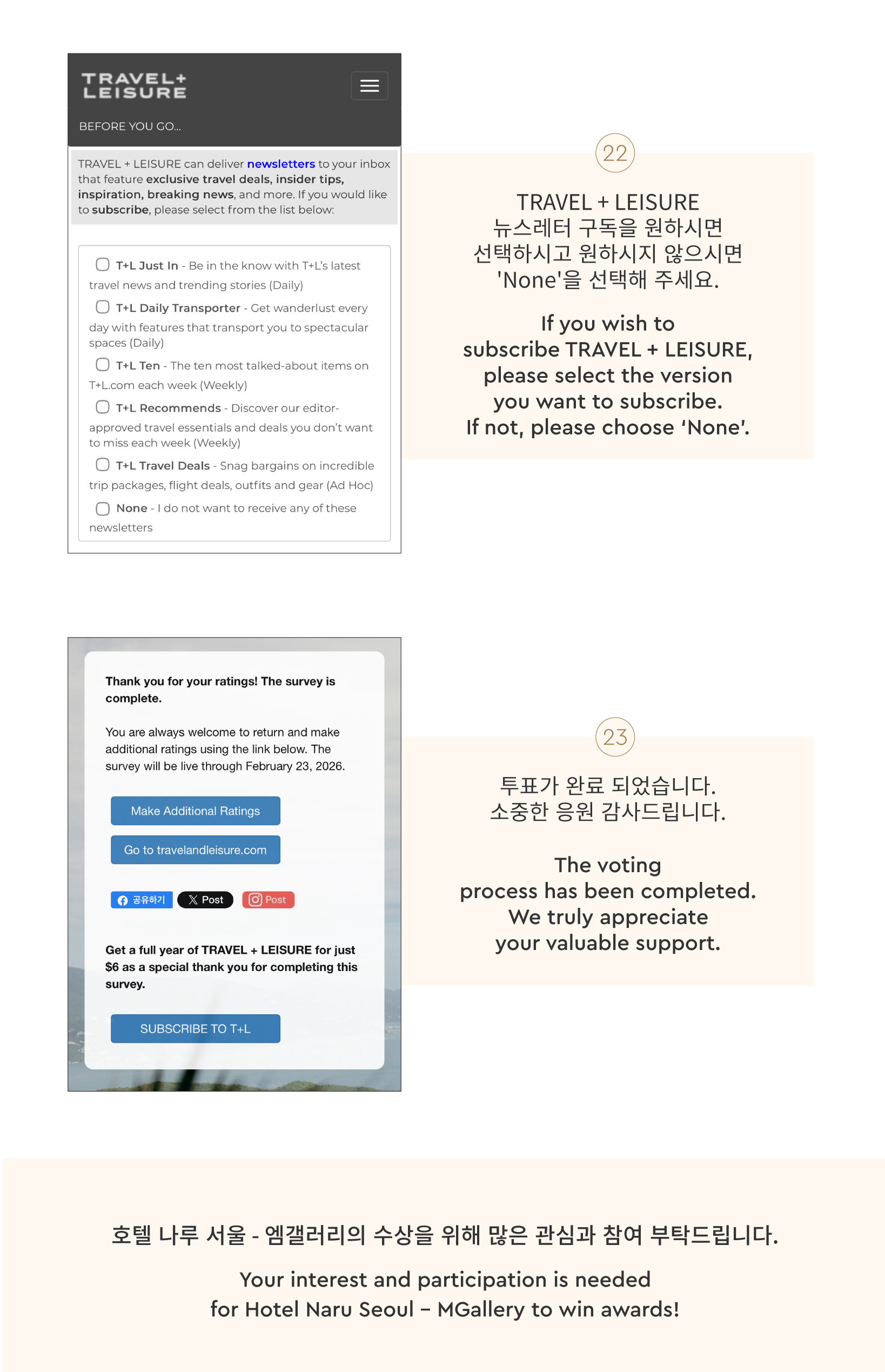 각 부문에서 득표수가 가장 많은 호텔이 글로벌군 수상자로 선정됩니다. 호텔 나루 서울 – 엠갤러리와 레스토랑 부아쟁은 최고의 뷰를 자랑하는 호텔과 레스토랑 부문 중 가장 많은 득표수를 획득해 1위 수상자로 선정되었습니다.